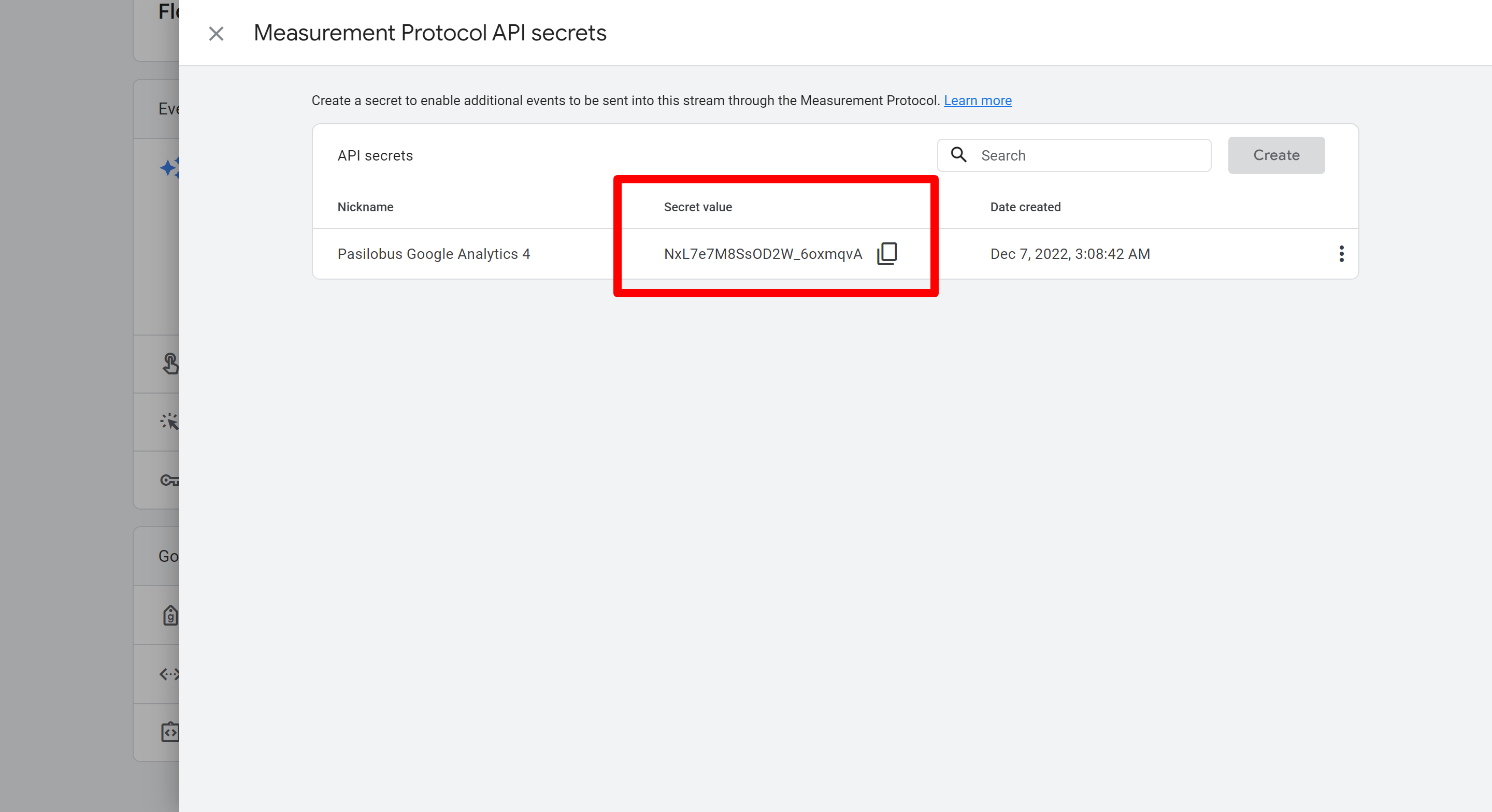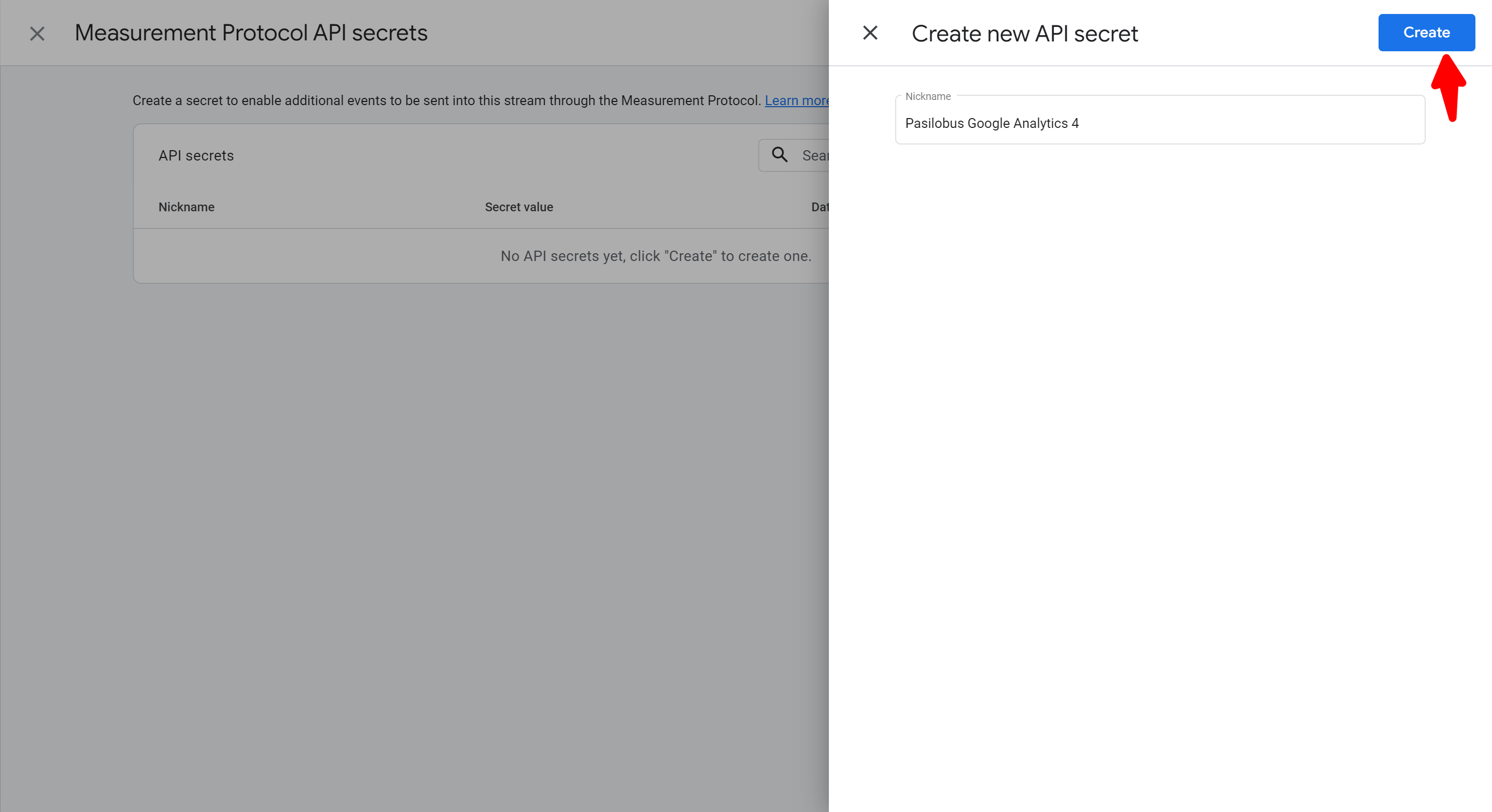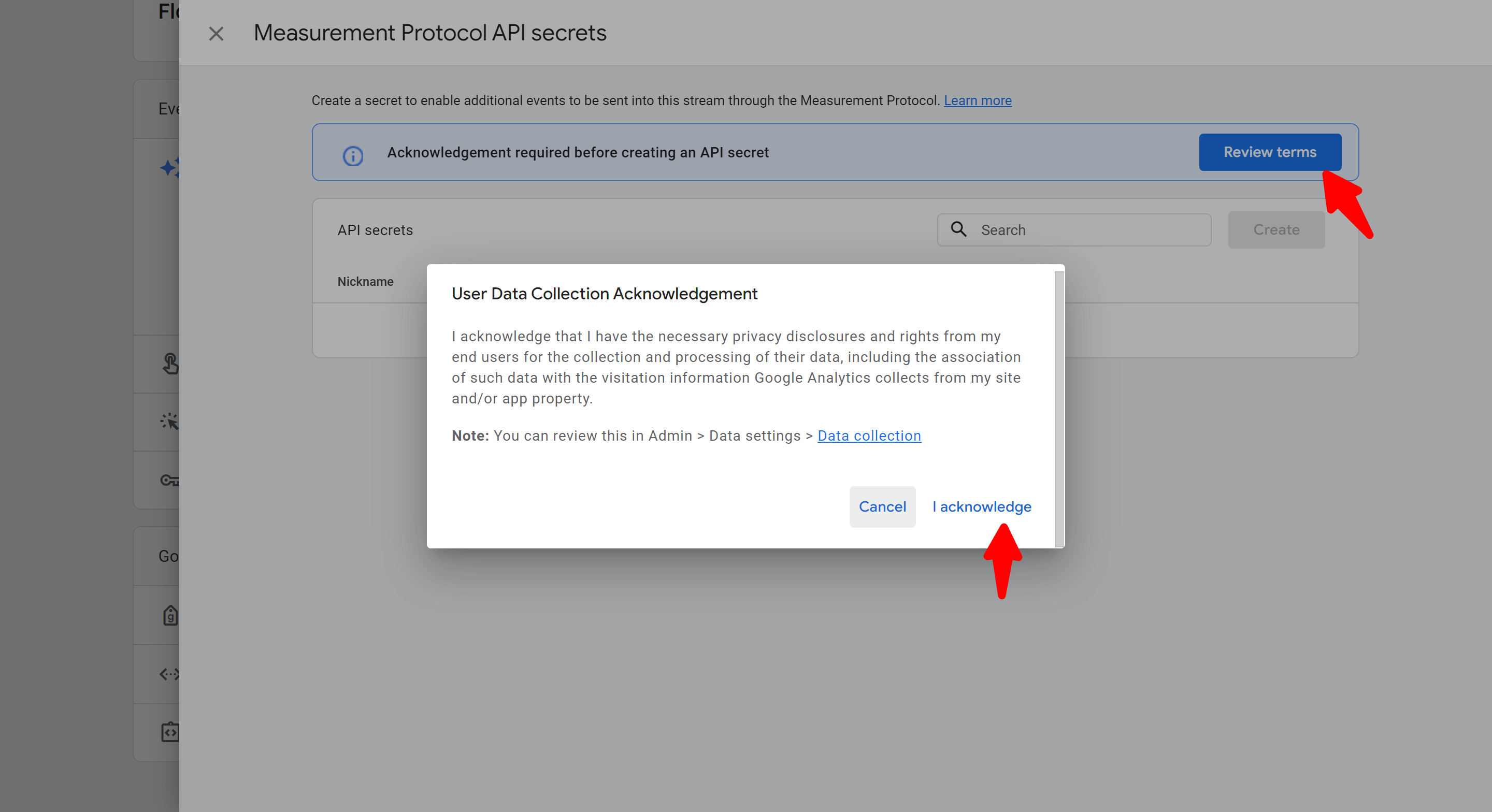 - Now we need to create your secret. On the same screen find and click Measurement Protocol API Secrets. On the next screen accept terms of service. And then create your API key.