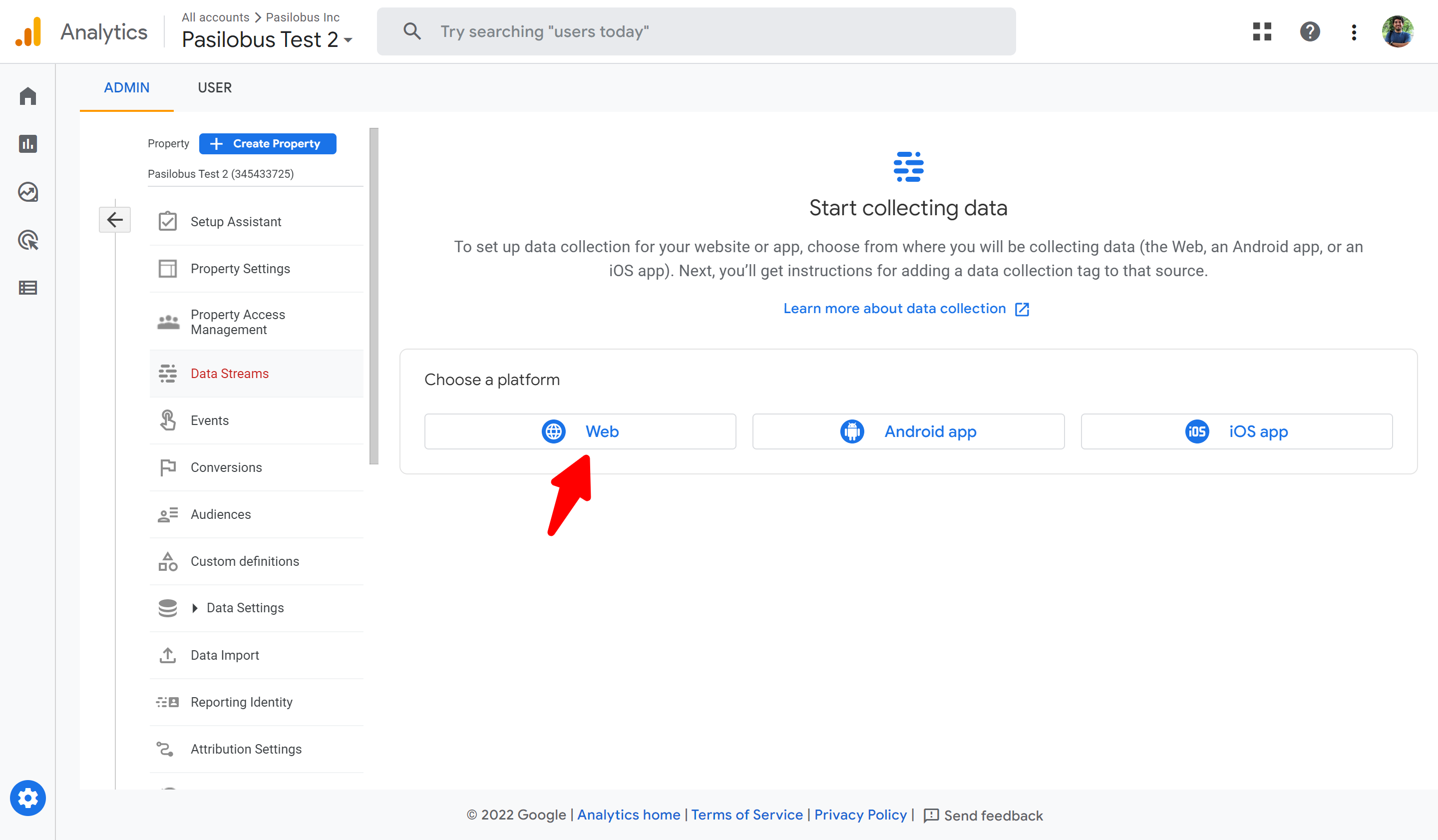 Select Web to create your stream. (If you previously created a stream for your Shopify store click on your stream instead.)