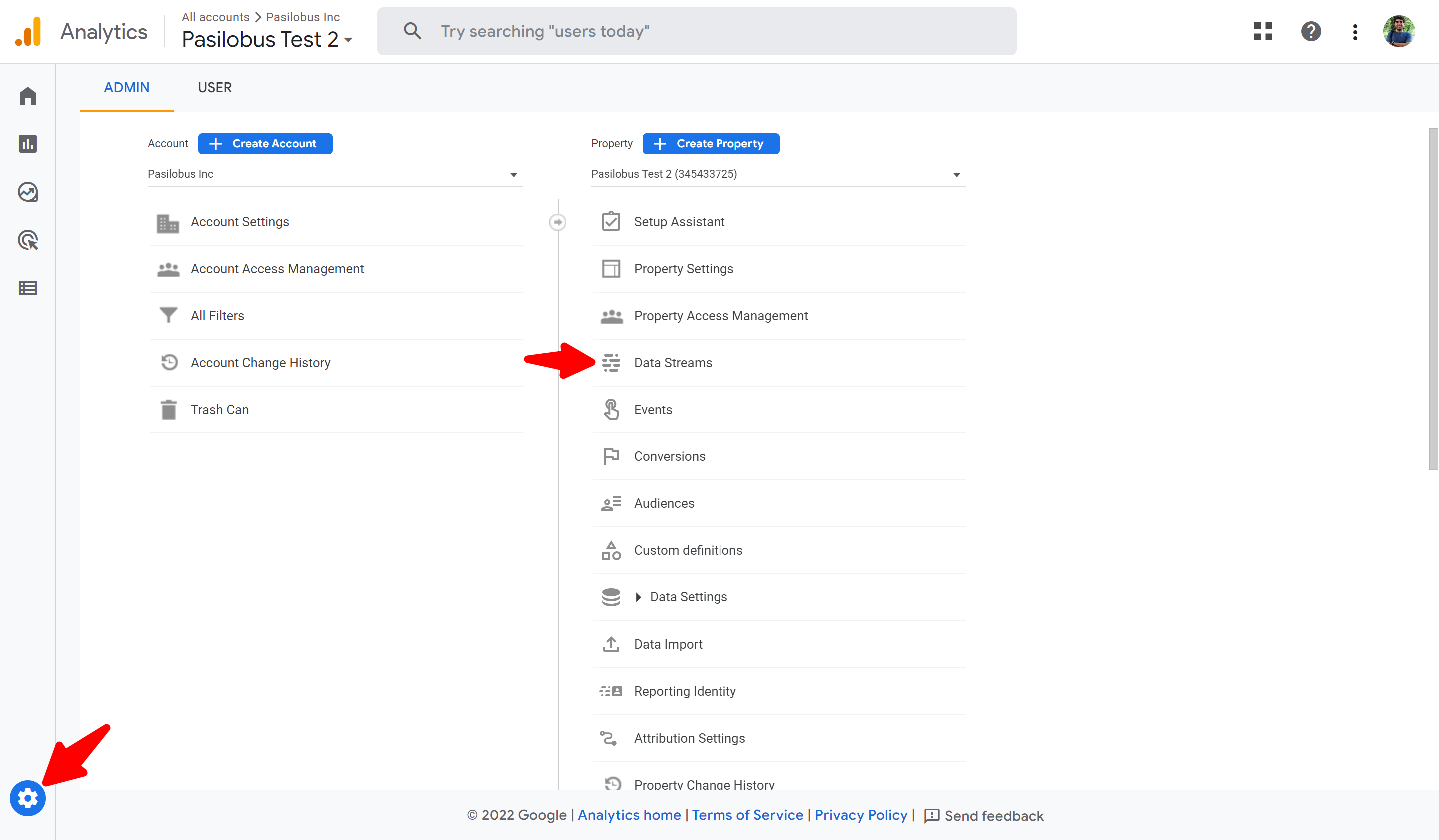 Log in to your Google Analytics account. Once you are in your dashboard, click the admin icon at the bottom of the screen and then click Data Streams.